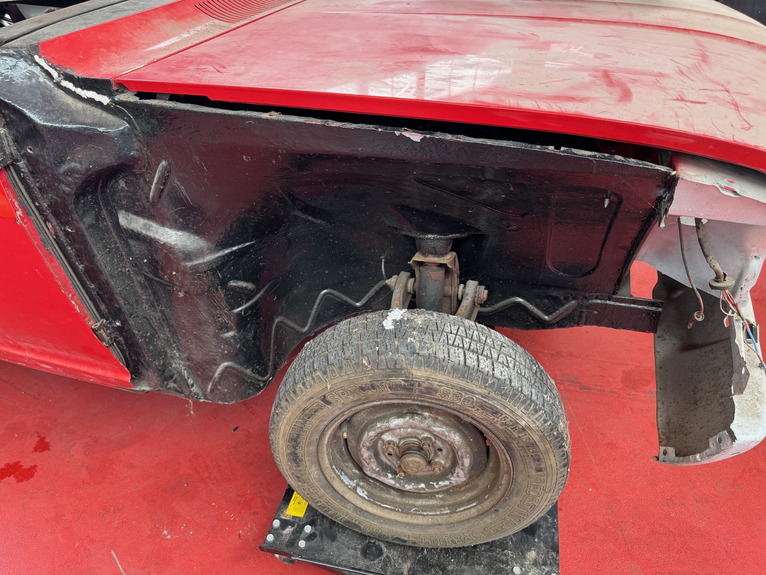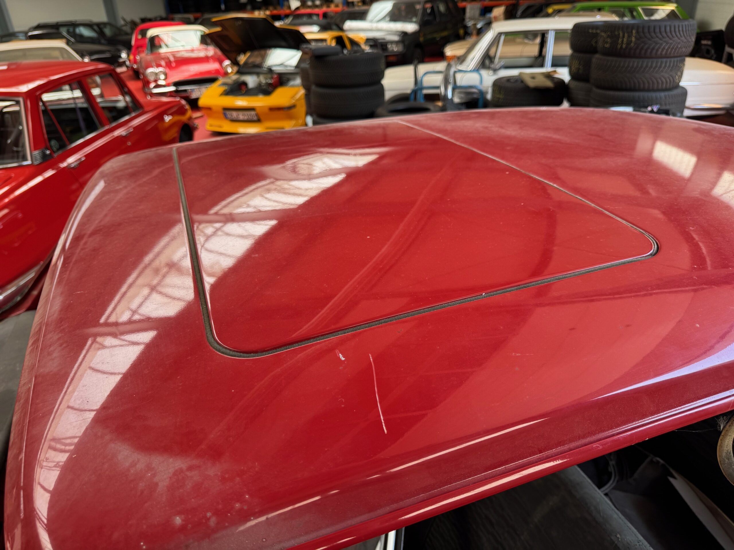 Der rote 2 Türer ist augenscheinlich weitestgehend komplett, auch wenn es auf den Fotos nicht so scheint. Scheibe, diverse Kotflügel, Lampen etc. sind dabei. Auch der Innenraum scheint vollständig und soweit in Ordnung.